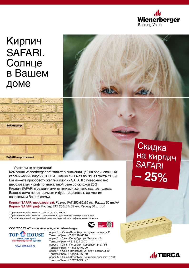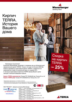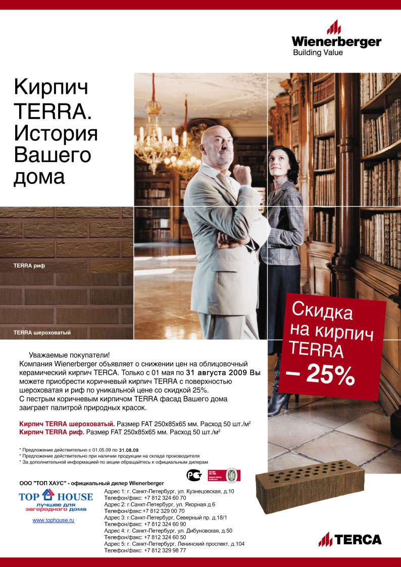 В торговой сети «ТОП ХАУС — Лучшее для загородного дома» снижены цены на облицовочный керамический кирпич «Terca». Только до 31 августа 2009 г. Вы можете приобрести кирпич производства Wienerberger (Эстония) по уникальной цене со скидкой 25%.