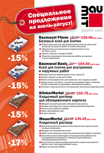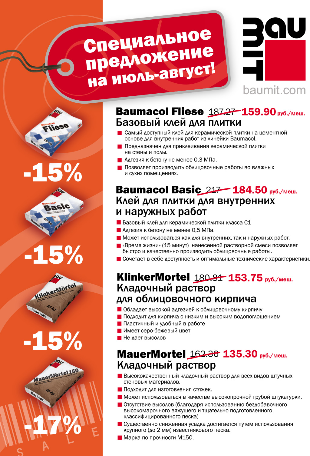 Торговая сеть «ТОП ХАУС — Лучшее для загородного дома» объявляет о начале сезонных скидок на продукцию Baumit (штукатурки и сухие смеси):