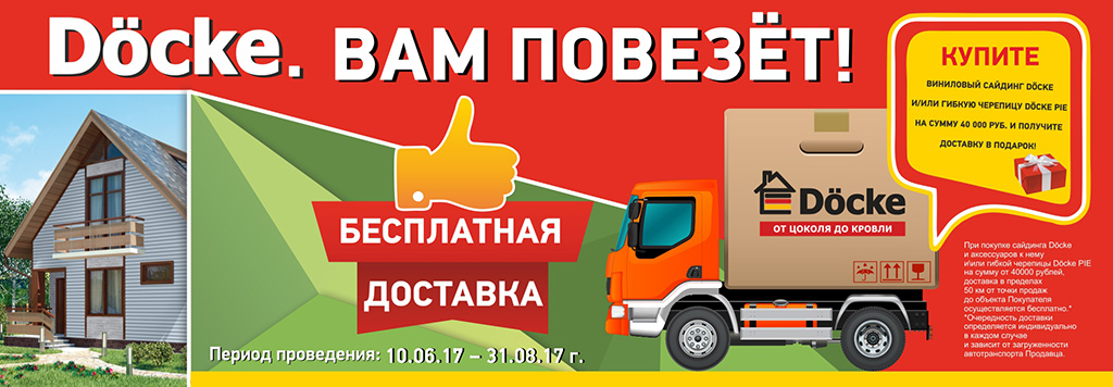 С 10 июня по 31 августа 2017 г. в Торговой сети "ТОП ХАУС - лучшее для загородного дома" действует акция "Docke. Вам повезёт!". При покупке винилового сайдинга Docke и аксессуаров к нему и/или гибкой черепицы Docke PIE на сумму от 40 000 руб., доставка в пределах 50 км от точки продаж до объекта Покупателя осуществляется бесплатно!